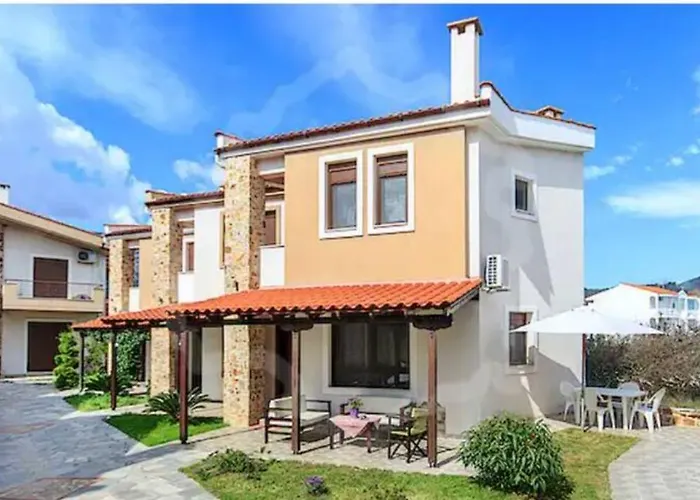 Du kommer att bo 750 meter från Paralia Nouveau Beach och ungefär 10 minuter med bil från Vathi Beach. Villan med 2 sovrum och 2 badrum ligger inom 10 minuter med bil från Marble beach.